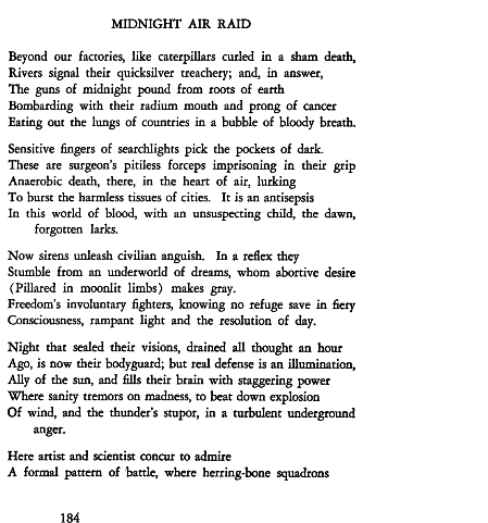 This poem is simply a poetic description of the events of a London air raid. He describes how what he saw such as the flak cannons and the large spotlights. He also describes the feelings of the people at the moment, the feeling of no true safety. He wants to emphasize that anyone can die at that point since their was no bunker that can hold a direct hit, meaning no one is safe. he also explains how the people are mad but must hold it in whilst hiding in cover.
